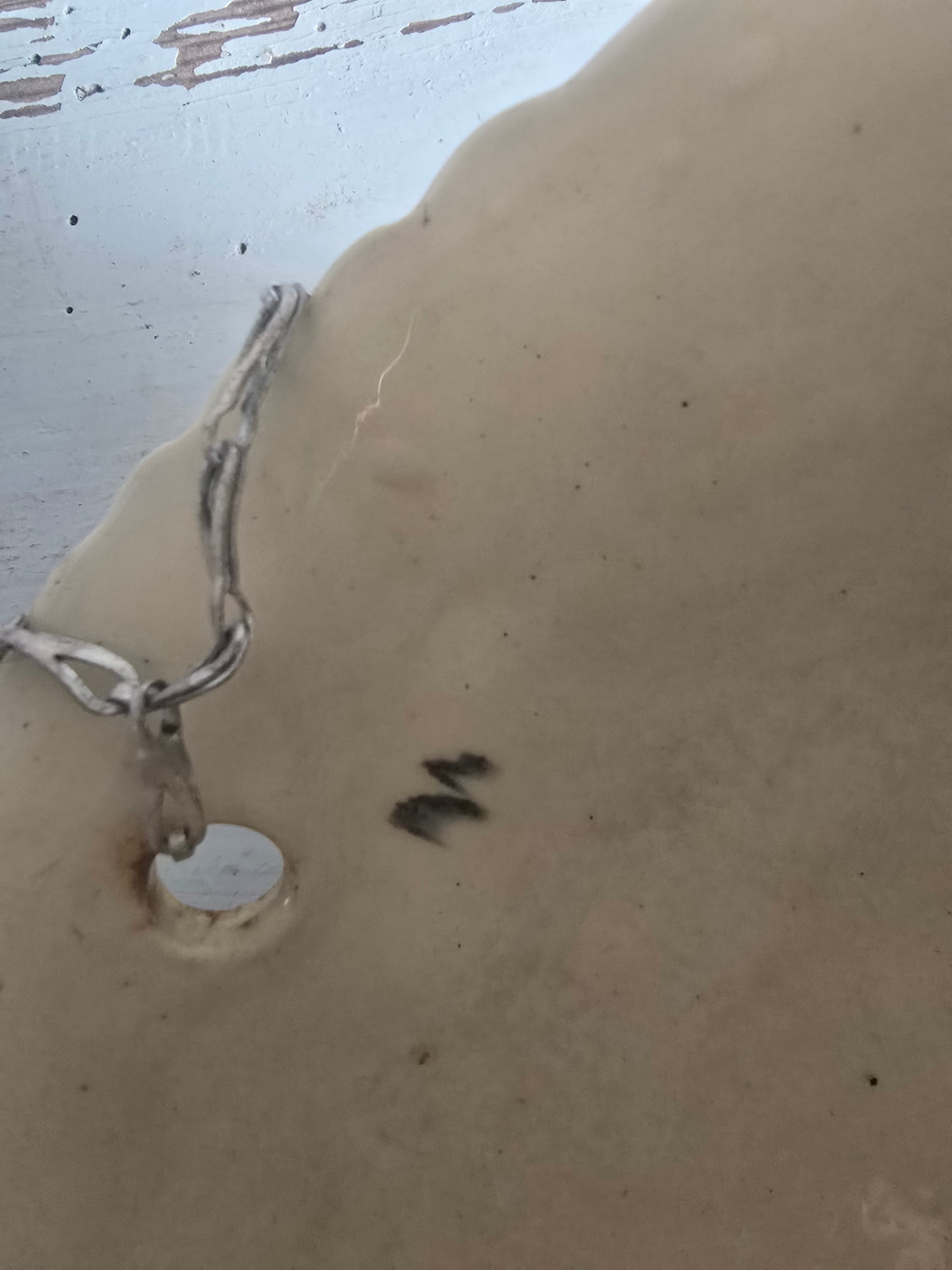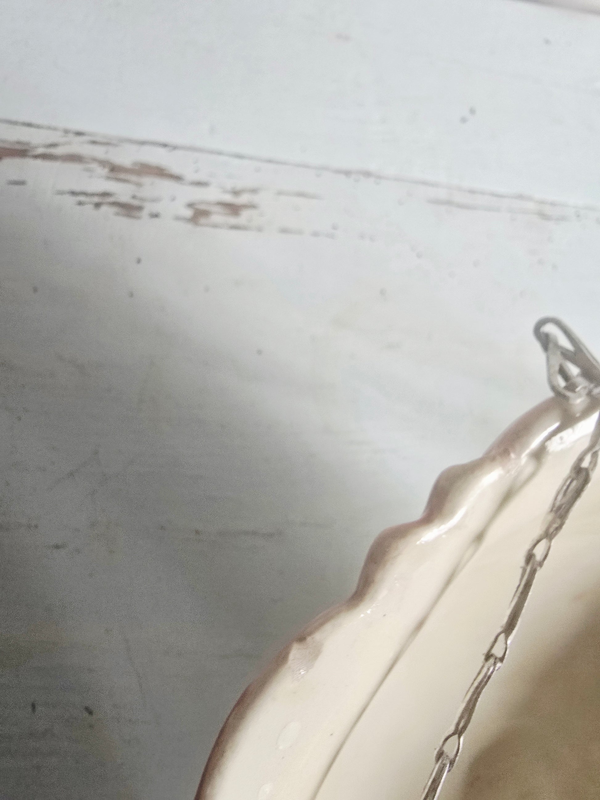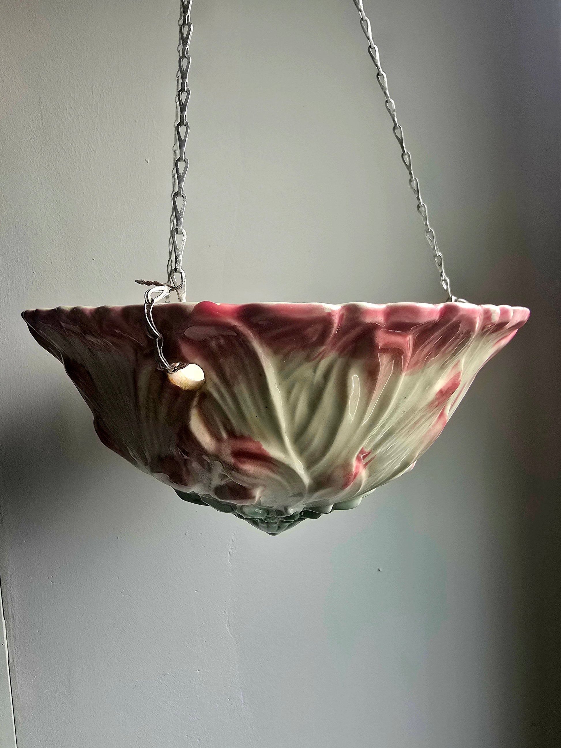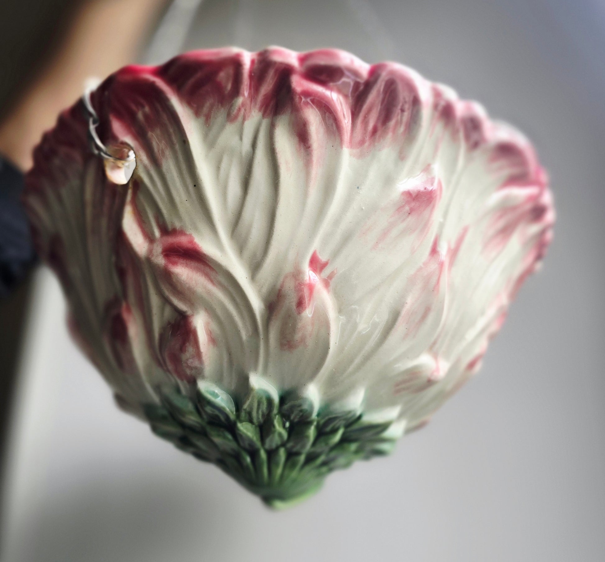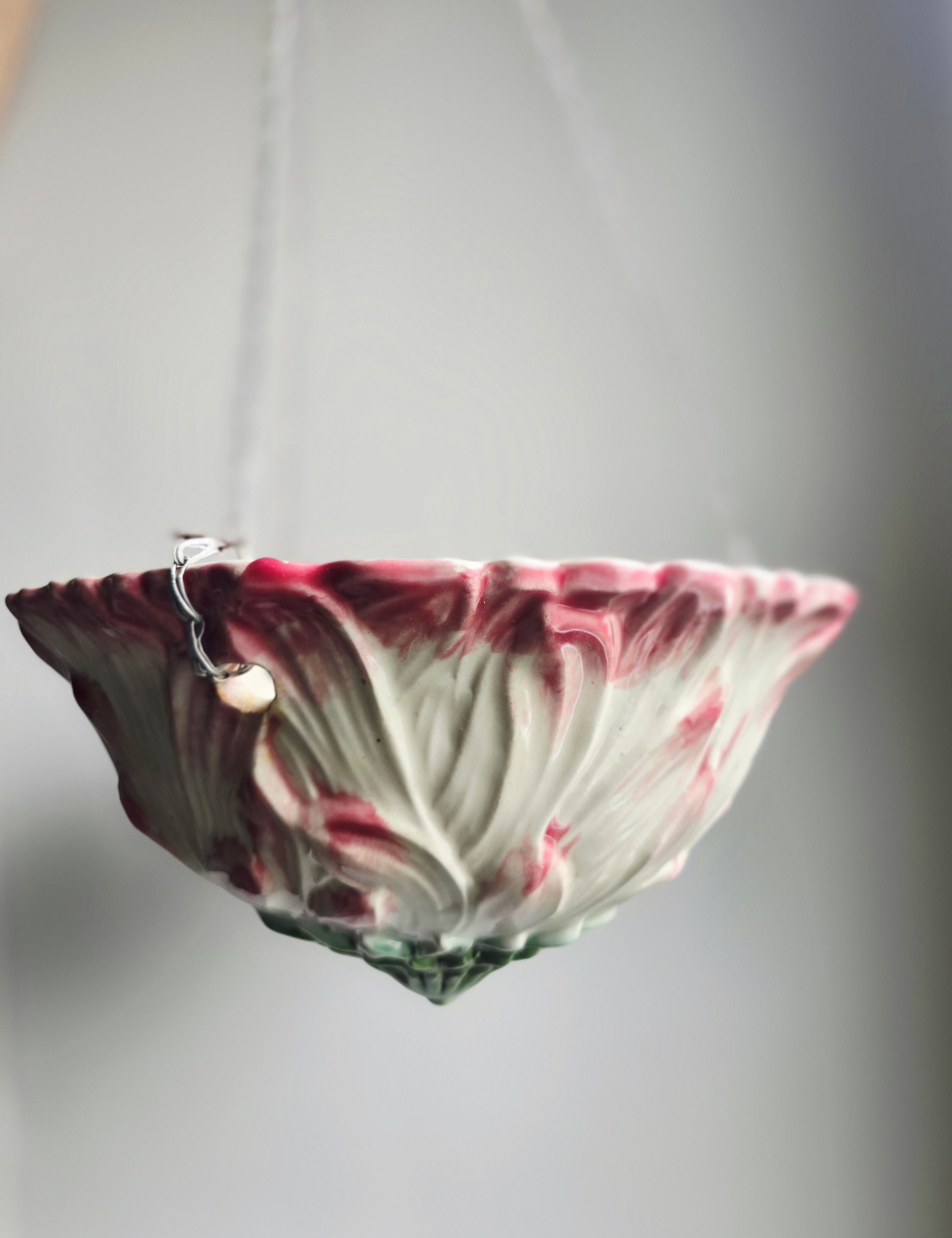 Magnifique jardinière à suspendre en barbotine en forme de dahlia.