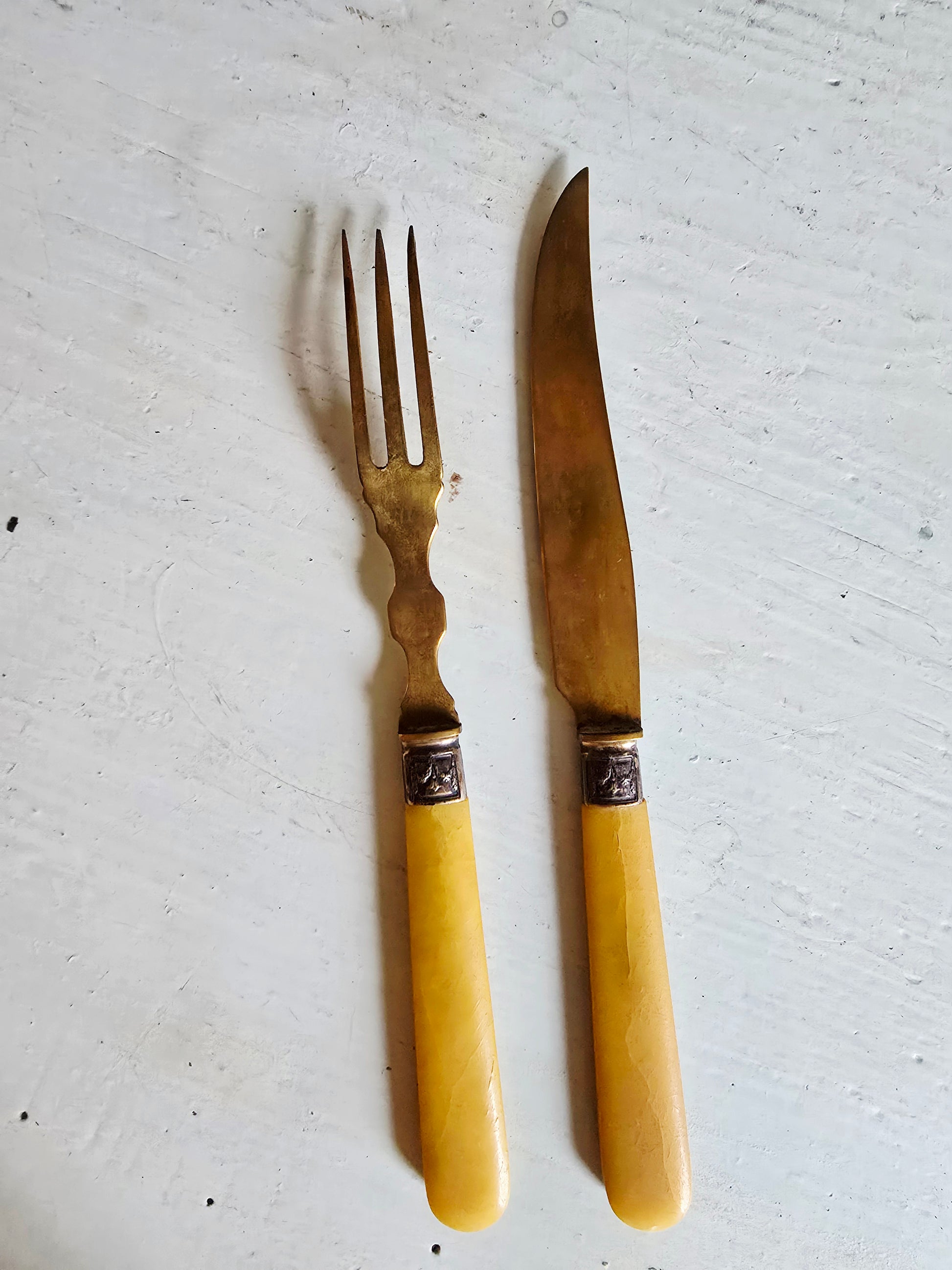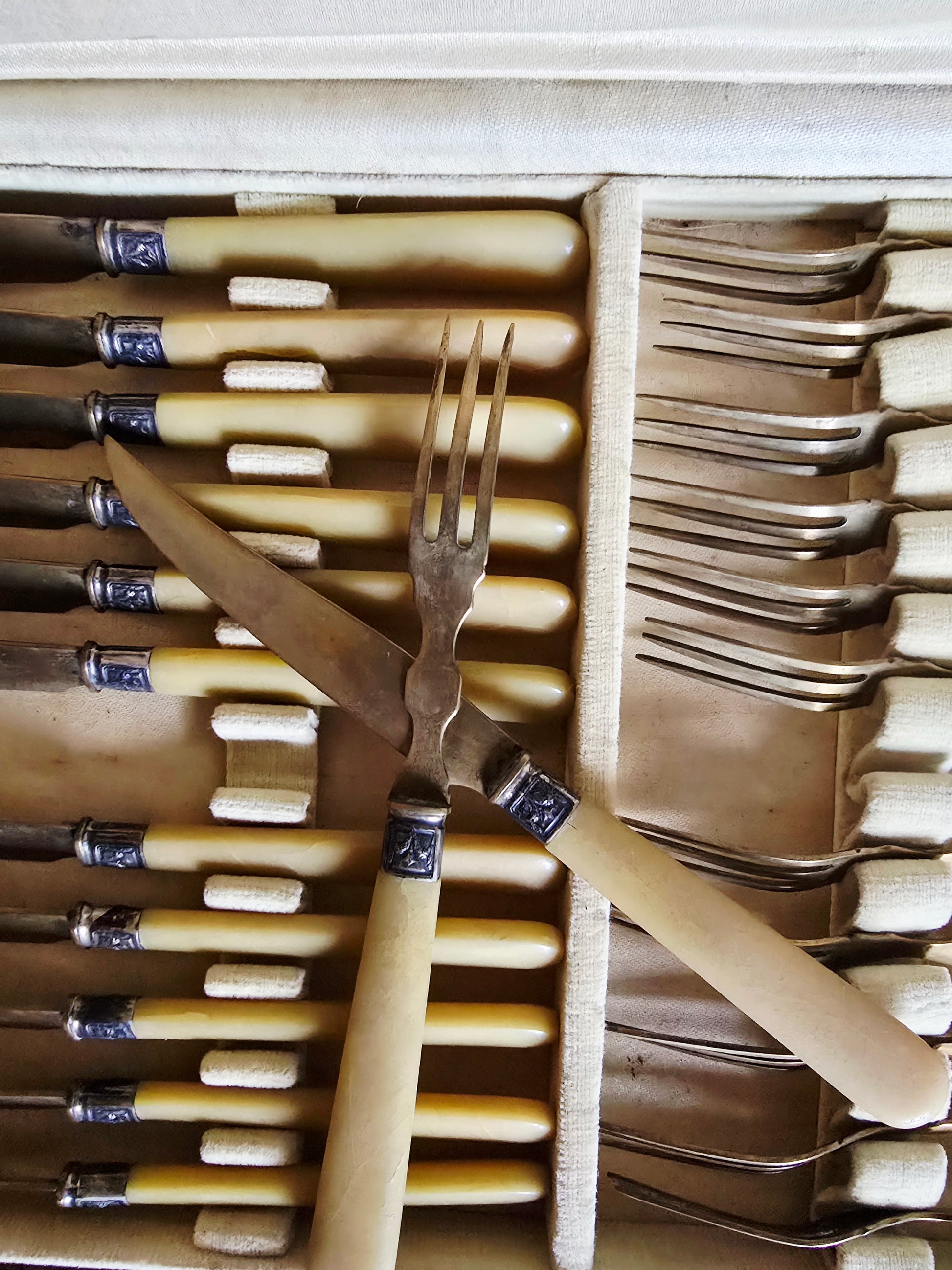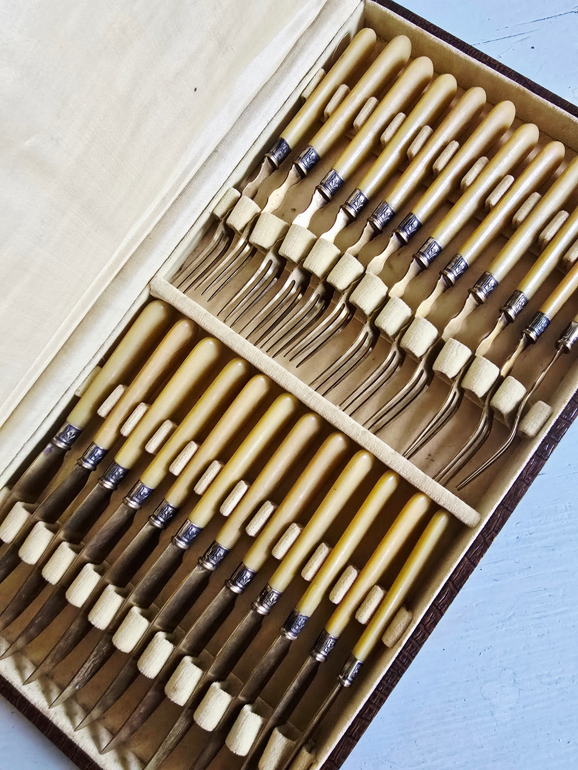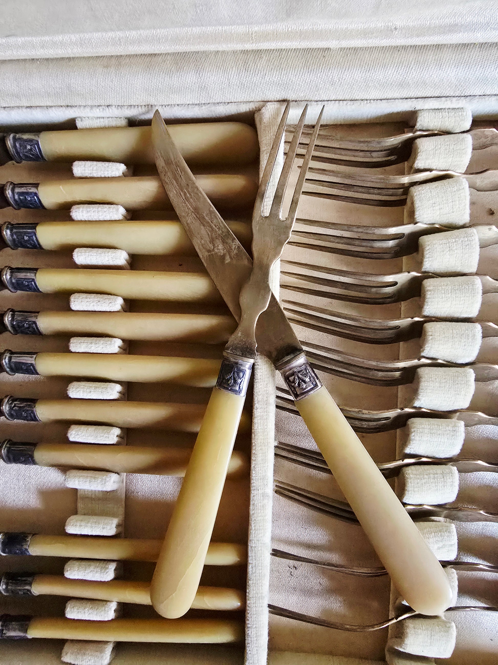 Belle ménagère de couverts à dessert/fromage en métal doré et corne.