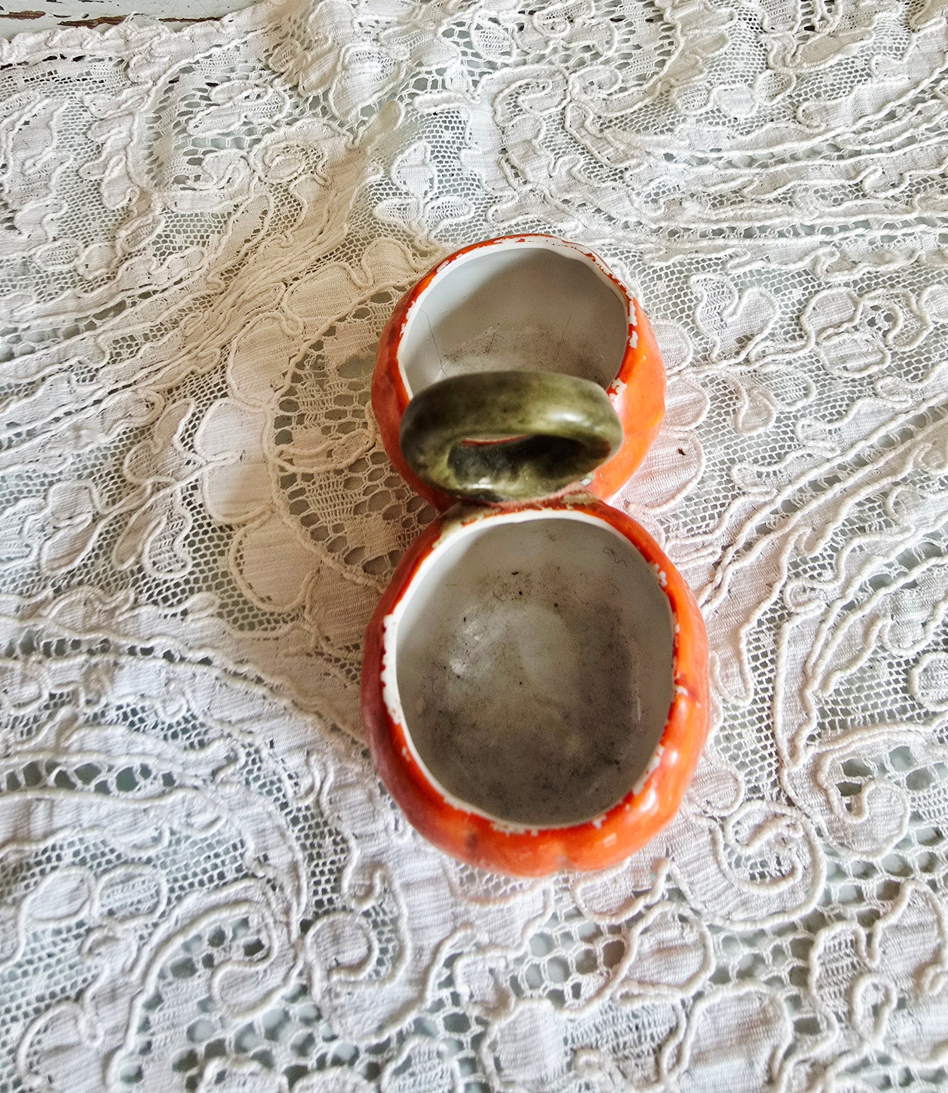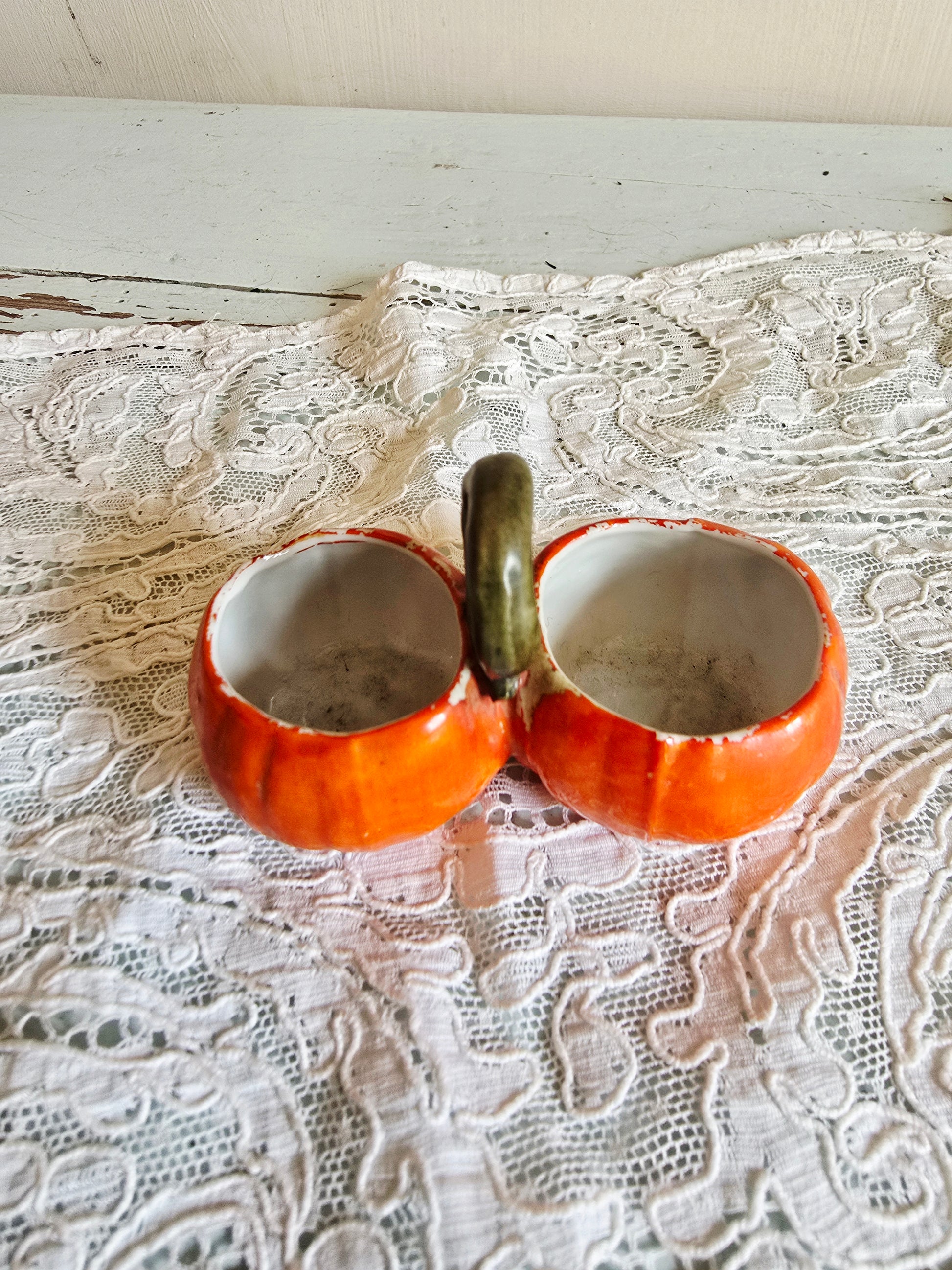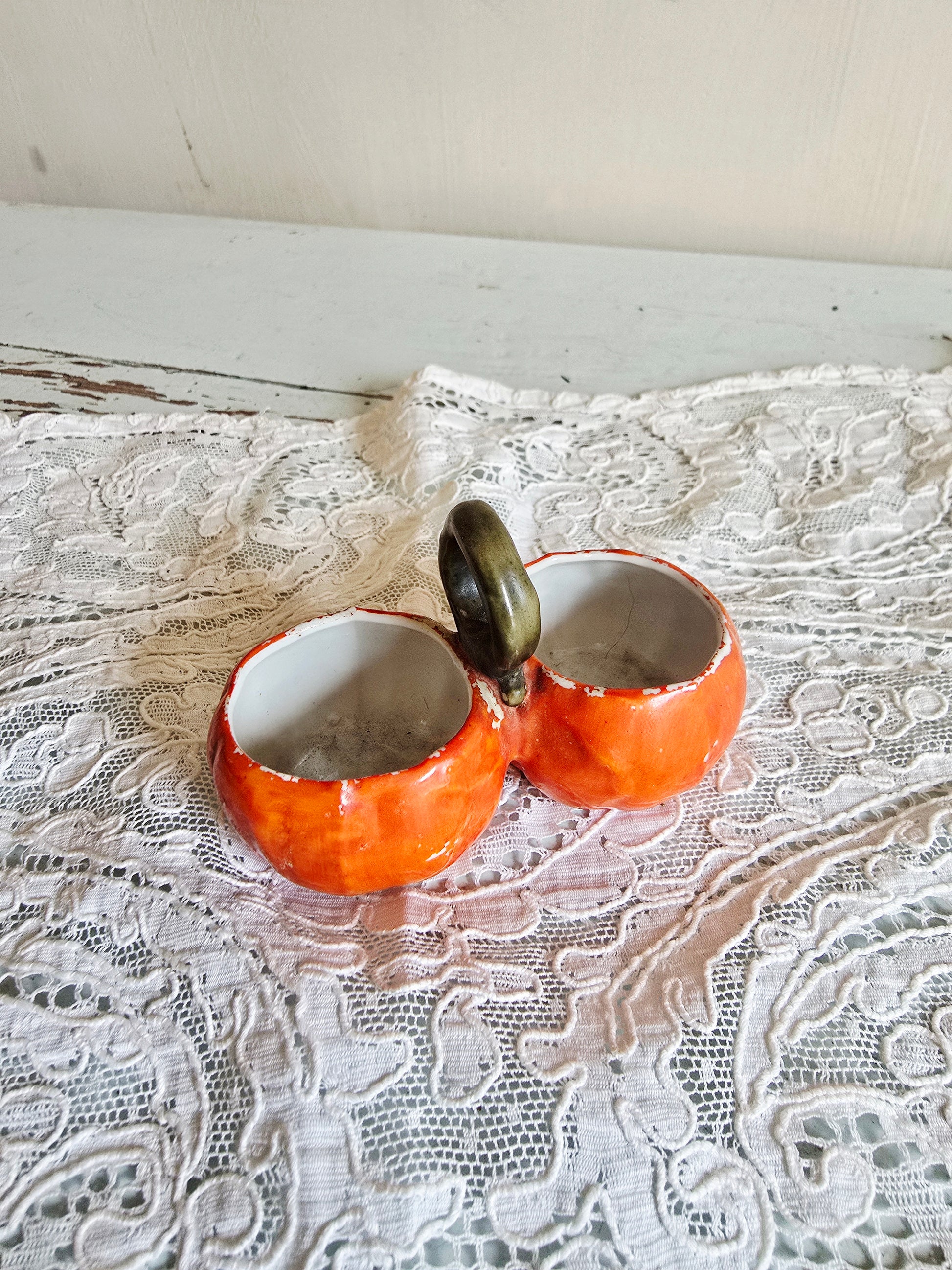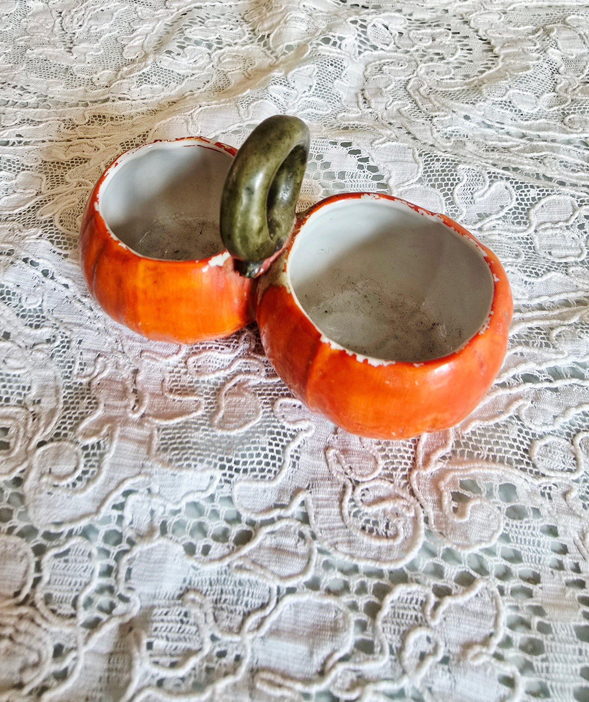 Adorable petit saleron double en barbotine en forme de citrouille.