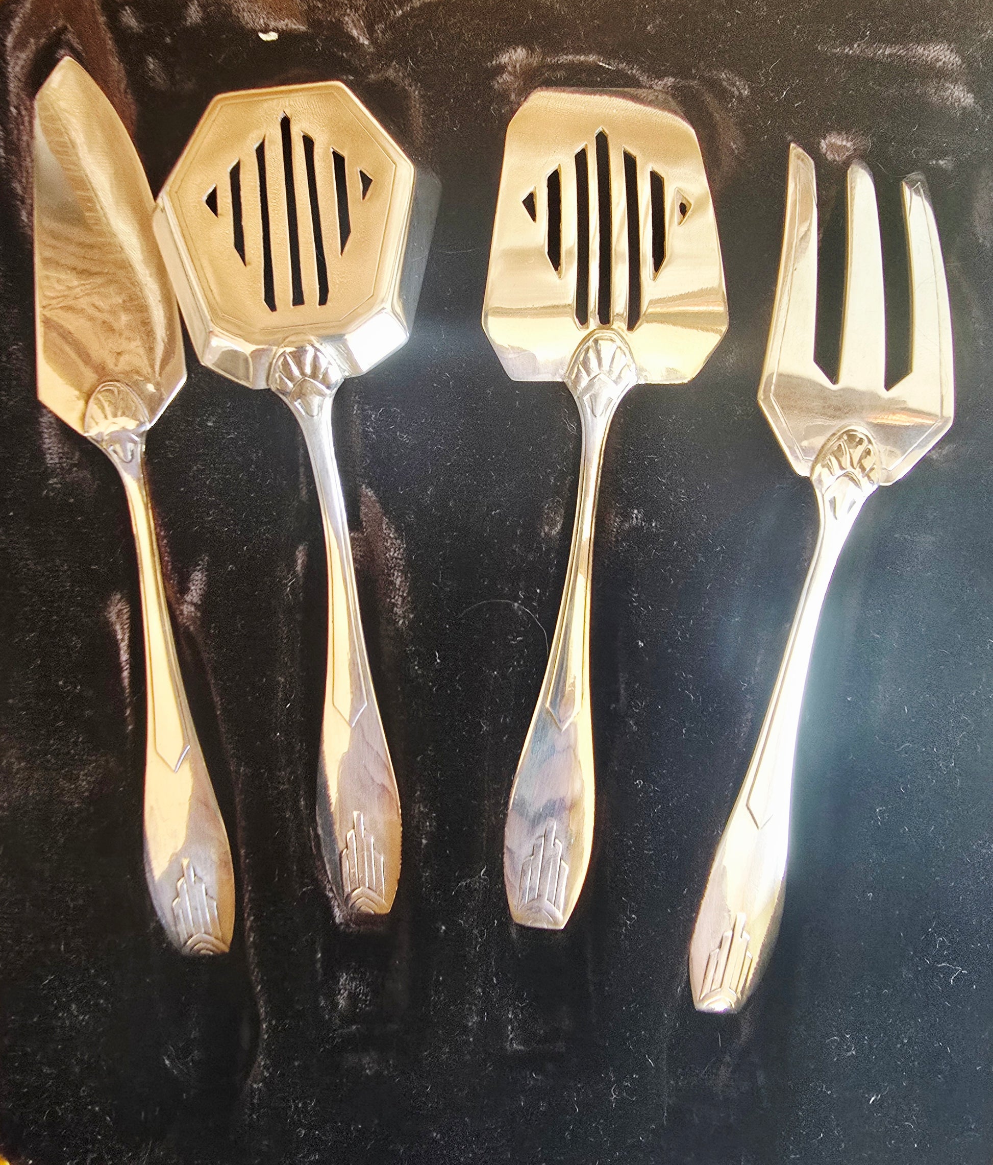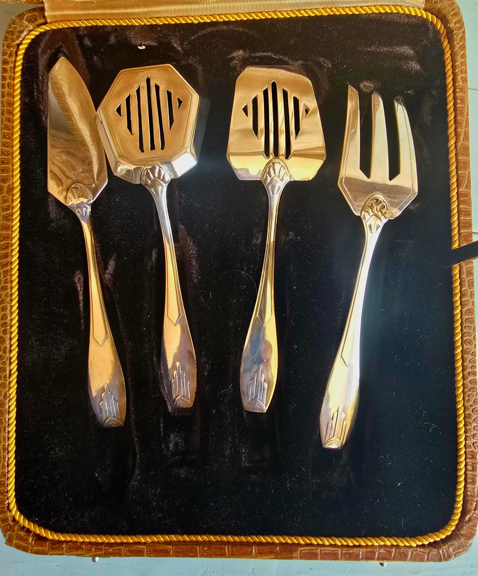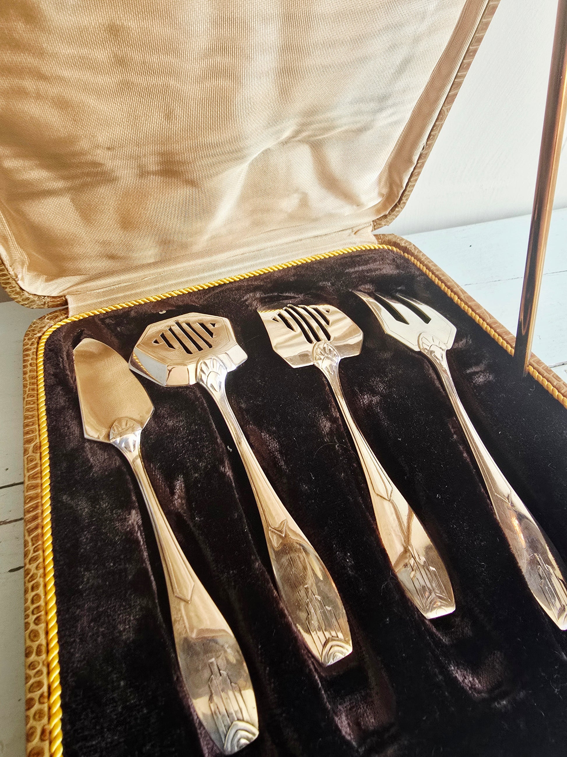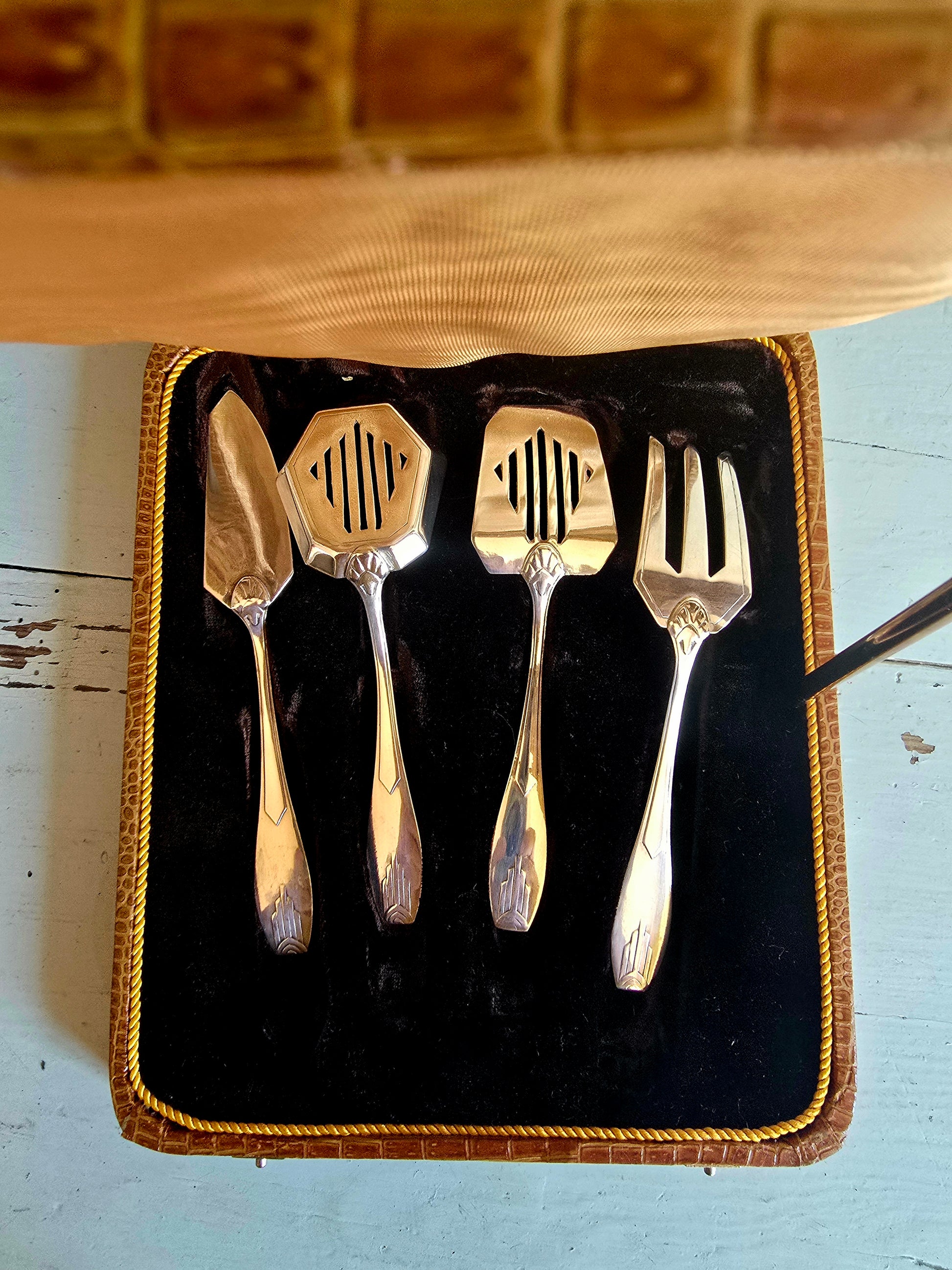 Pour les collectionneurs, je vous propose ce coffret de couverts à mignardises Art Deco 1925-1940 en métal argenté. Chaque pièce présente 2 poinçons. Présenté dans sa boîte d'origine.